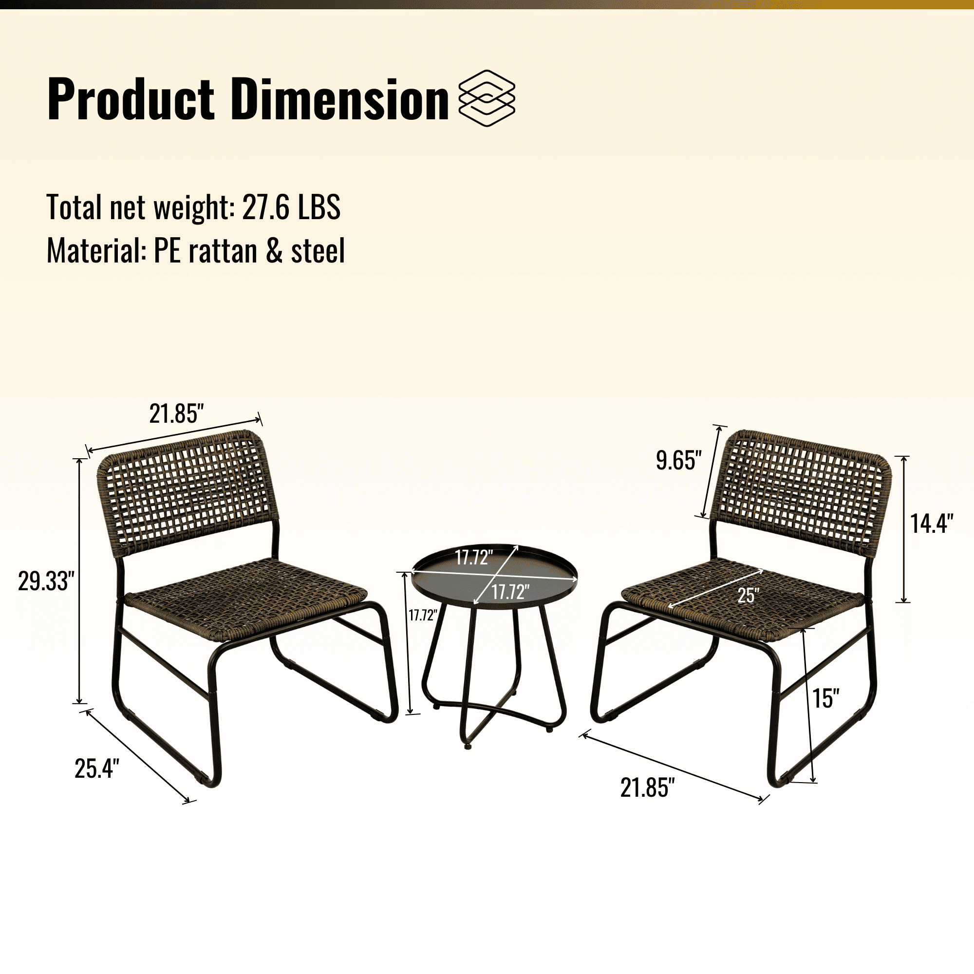 ONE SET: includes two single chair size 21.85 x 25.4 x 29.33 inches; a round table size 17.72 x 17.72 x 17.72 inches, clear instruction paper and extra a free part of hardware for replacing in case needed.