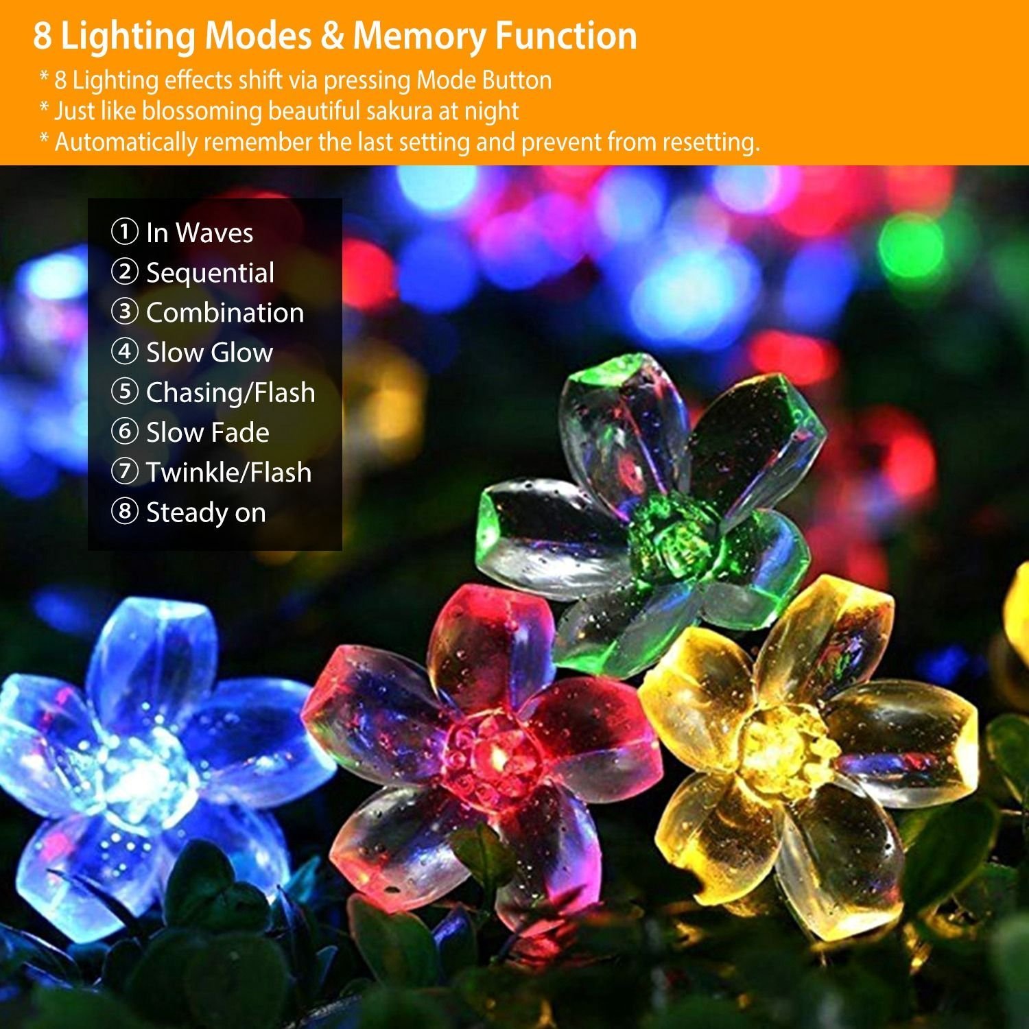 **8 MODES STRING LIGHTS & MEMORY FUNCTION*:Our string light have 8 lighting effects and shift via pressing Mode Button,including in waves,sequential,combination,slow glow,chasing/flash,slow fade,twinkle/ flash,steady on. Multiple colors and different styles of lighting changing effects are intertwined,just like blossoming beautiful blossoms at night and having the built-in memory chip will automatically remember the last setting,saving you the trouble of resetting.