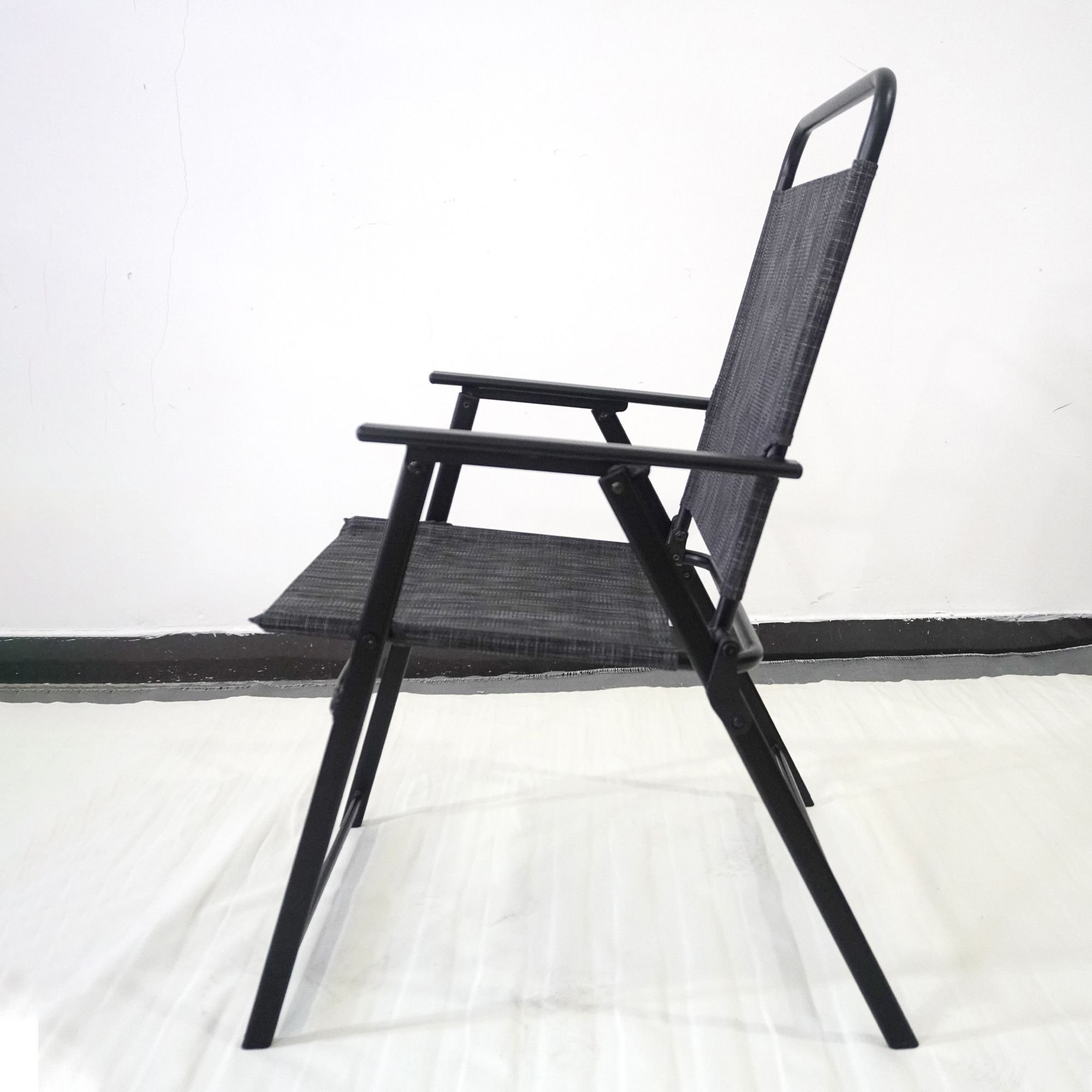The For Living Sling Folding Dining Set features a rust-resistant, powder-coated steel frame for durable and long-lasting use