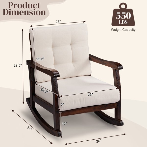 Experience the ultimate in relaxation with this Outdoor Wood Rocking Chair. Featuring wide curved armrests, and thick, plush cushions, this rocker invites you to unwind and enjoy the soothing motion of a perfectly balanced rocking chair. The ergonomic design cradles your body in comfort, while the soft, detachable cushions provide an extra layer of coziness. Whether you're reading, or enjoying your morning coffee, this solid wood rocking chair is the perfect addition to your patio, porch, or backyard, offering a serene escape from the day's stresses.