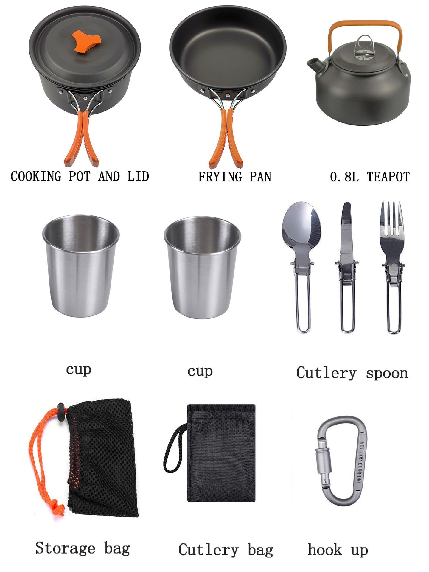 Suitable for 2-3 people, including a large pot, frying pan, a teapot, two stainless steel cups, a fork, a spoon, a dinner knife, a latch, the set of pots and pans using aluminum, after advanced hard treatment, high temperature resistance, abrasion. Knife, fork and spoon selected 410 stainless steel materials. Selected 304 stainless steel cups, special customization, can be placed near the teapot inside, easy to carry.
