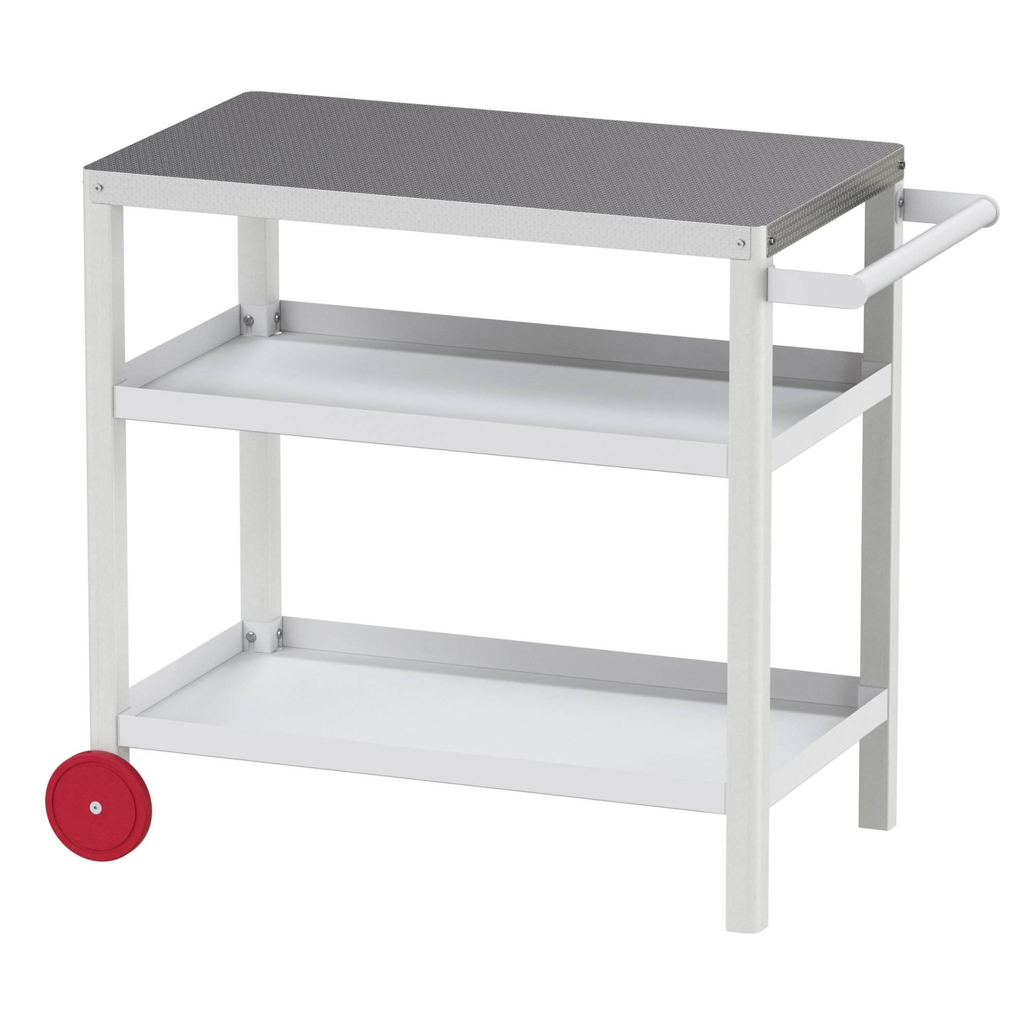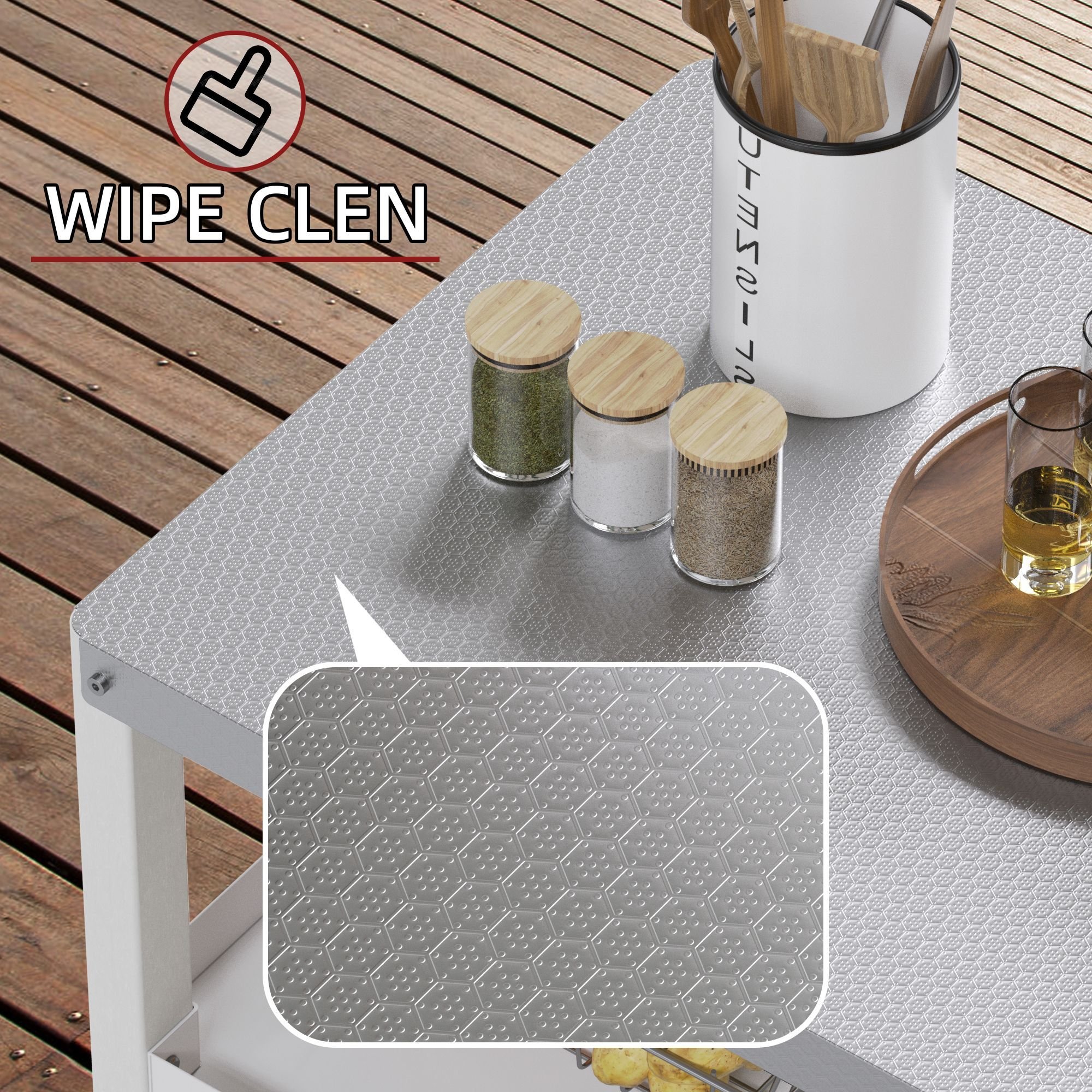 1.[Rust-Proof Stainless Steel Countertop] If you tend to use this outdoor prep table frequently, then choosing a stainless steel countertop is more suitable. One reason is that this stainless steel countertop is easier to clean, and will not deform and discolor. The stainless steel used for the countertop is very thick and high-quality. Stainless steel countertop has a very long service life and is suitable for long-term use.2.[All-weather Resistant Prep Table] Compared with plastic and other outdoor wood dining tables, the stainless steel table top is more durable and withstands rain, wind and sun. Plastic will inevitably deform over time, and wood is prone to mold in humid areas and cracks under direct sunlight. Besides, this prep table has 2 wheels and 2 table legs. Compared with 4 wheels, it is more stable and not easy to shake, so it is suitable for use in all regions and any weather.3.[HDPE Material] It is suitable for use in any weather and any area, and will not be deformed, discolored or shortened in life due to being placed outdoors. Even if you live in a very humid place, this all-weather removable prep table won't get moldy or rot. If you put it in the sun, its HDPE frame will not be discolored or damaged. If the place where you are is very windy, this preparation table will not be blown over in strong winds or tipped over like some lightweight plastic tables.4.[Outdoor Pizza Oven Grill Table Prep Cart ]You can roll it across your yard to the BBQ area .This is not a super lightweight plastic prep table. It has stainless steel top with HDPE frame. The prep cart is around 34 pounds. You can use it for portable barbecue grill or put your pizza oven on it. It's very easy to roll by slightly tilting it with the attached handle and moving it to wherever you like. The table cart still has a practical size for moving around or getting through any doorway.5.[ Heavy-Duty Two-Shelf Outdoor Prep Cart ] This cart is weighing about 34 pounds. It's fair to say the table is heavy, but not so heavy that it's hard to move freely The size and weight of this table are convenient for everyday use, no matter where you are moving it through any door. Due to the weight, you don't have to worry about tipping over when you use it outdoors.It provides additional shelf storage space for your outdoor use, which is very practical.6.[Detailed Instructions for the Assembly] We have instructions for the assembly. The instructions are very brief, consisting of a series of well-marked diagrams. The numbers is for packaged screws, bolts, etc. Alphabet are showing you what part it is in the order to install.Once correctly assembled, you will have an extremely sturdy unit that fully fits for long term outdoor duty.7.[Utility Outdoor Cart and Low Maintenance] You can put pizza oven, portable grill, deep fryer on the countertop. They will rests securely on the top surface of this cart. The cart table top is made out of stainless steel so it will sustain all the food preparation and knife cutting. The table weight distribution is well balanced, so it will not tip over when you use it. The stainless steel top means durability, utility and little maintenance.