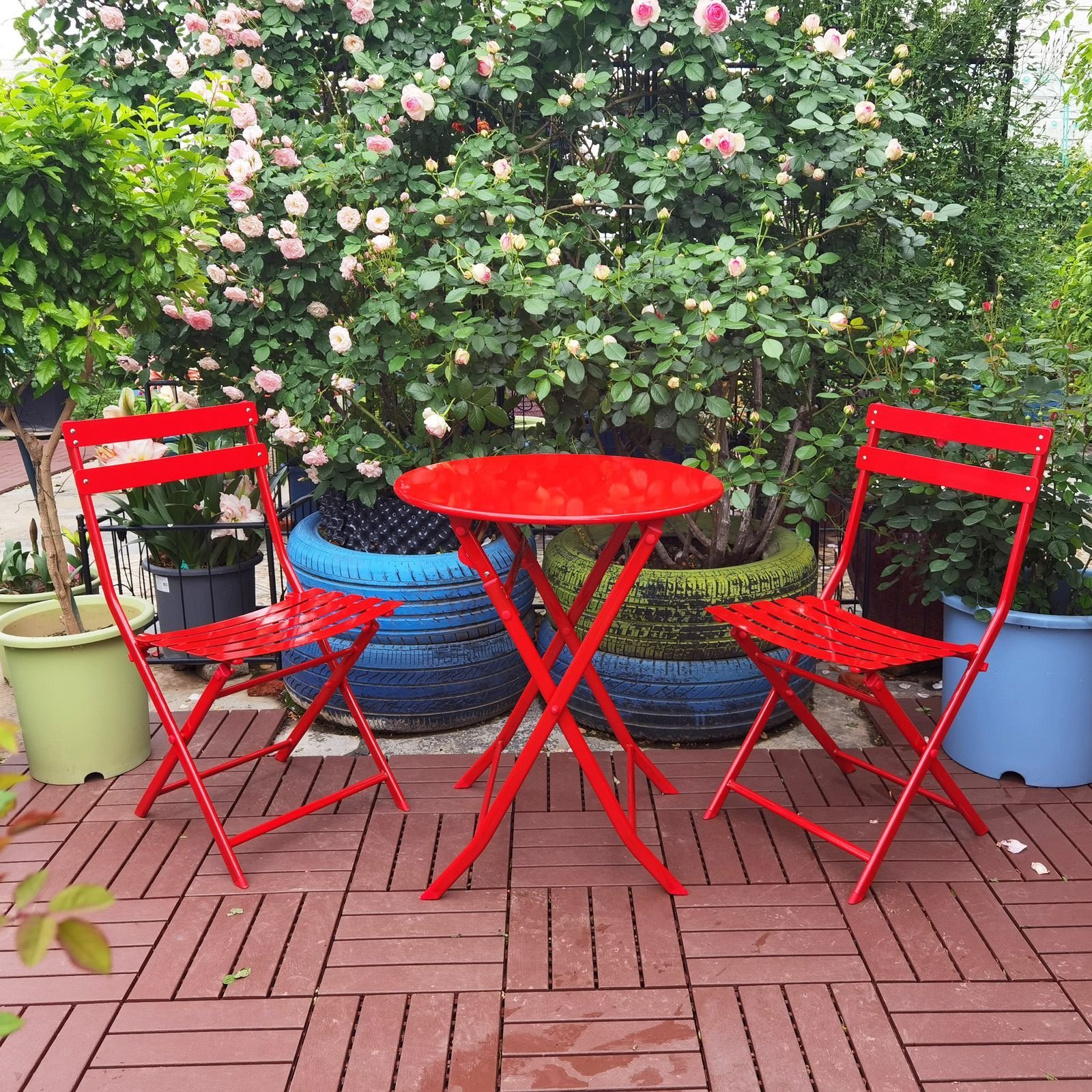 1.3 PIECES FURNITURE SET: The 3-piece patio bistro set include 2 folding chairs and 1 round table. Stylish color with wide and thick horizontal bars on the seat and backrest for both comfort and sturdiness. It provides bright, vibrant colored for your indoor or outdoor living space.